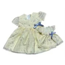 Doll Clothes Superstore Size 5 Matching Girl And Doll Yellow Sequin Dress. A very beautiful dress that is difficult to picture, the images do not do justice. The material is a soft cotton blend with applique threads and sequins in the material. A silver bow accents the waist. When lying flat the dress measures 12 1/2 inches from side to side at the waist. It is 28 inches from the shoulder to the hem. The doll dress fits 18 inch girl dolls like American Girl, Our Generation, My Life dolls. This listing is for one child and one doll dress. The doll is not included.