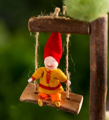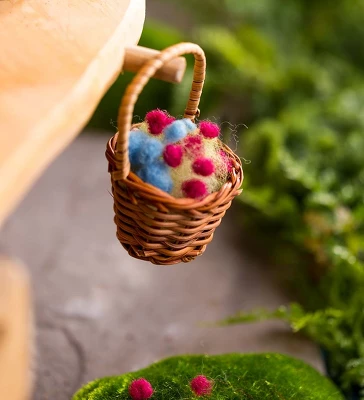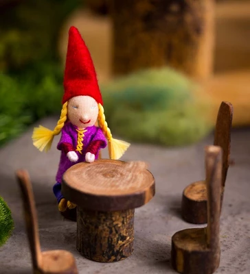 Our Tree Fort is a magical woodland wonderland where all of our miniature dolls and animals want to live. These pretend play doll forts are designed and made from smaller salvaged branches of hazelnut and alder wood trees, so each one is as unique as your child’s imagination. Common features of each fort include a 20″ diam. base, three additional platforms, twelve building branches, seven stackable pieces, a solid wood staircase, two balconies, a rope ladder, a crow’s nest, a swing, a bridge, and detailed assembly instructions. The assemble fort is approx. 28″ tall (adult assembly is required). Greenery is not included, but feel free to forage for natural materials like moss, leaves, and wildflower blossoms to make your fort attractive to passing fairies and gnomes! The Tree Blocks Furniture Set includes a robust collection of bedroom, living room, and kitchen furniture for a tiny woodland family of four. Made of rough-hewn salvaged blocks of wood, each set of furniture is as unique as the fairy family who makes use of it. The Woodland Animals is an enchanting little collection of Mother Nature’s most endearing woodland babies: bunny, fawn, owl, hedgehog and squirrel, each individually hand-painted in Poland. Handcrafted from natural fabrics, our happy forest family is dressed for woodland dwelling in warm wool tunics and bright stocking caps. Featuring posable wool-wrapped wire bodies, the Woodland Friends includes 4″H boy and girl; approx. 5″ tall mama and papa, and an itty-bitty baby that comes tucked in a sling.