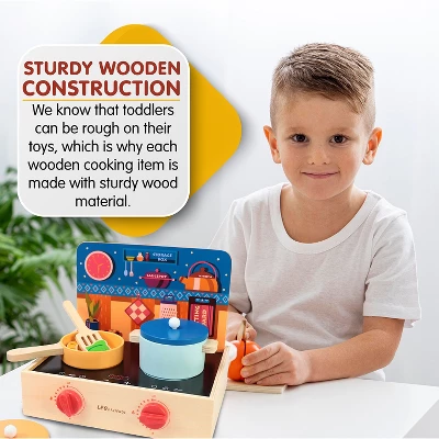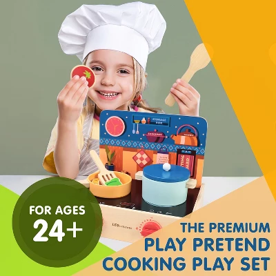 - THE PREMIUM PLAY PRETEND COOKING PLAY SET: Every kid wants to get into the kitchen and cook, just like their parents. Weve created an interactive wooden play set that makes it easy for toddlers to pretend-cook, right by their parents side. Now they can get creative in the kitchen, without the dangers of fire, burners, and sharp knives