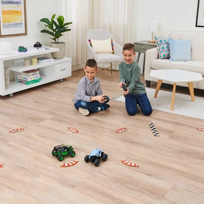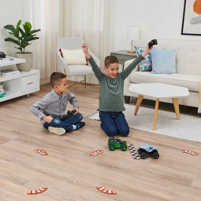 Race your favorite Monster Jam trucks head-to-head with the 1:24 scale Racing Rivals 2-Pack! This exclusive remote control set includes Grave Digger and Megalodon, plus eight track pieces and a start/finish line to create your own Monster Jam arena! Choose Grave Digger or Megalodon and race against your friends in an epic face-off! With two easy-to-use dual joystick controllers and 10 AAA batteries included, you can control your Monster Jam RC trucks from up to 200 feet away and roll right out of the box! Featuring authentic Monster Jam styling, official BKT tires and look-alike chassis, the 1:24 scale Grave Digger and Megalodon always deliver big fun! Race and perform awesome stunts, crazy crashes and brutal bashes! Host your very own Monster Jam rally and bring the action home with the all-new, official 1:24 scale remote control Racing Rivals 2-Pack!